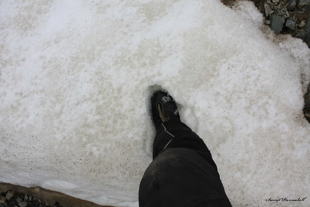 I reached the semi frozen Sooraj Taal. A lot of tourist were there staring at the beautiful landscape. Most of them were foreigners. I went a little ahead of the lake and parked my bike as I noticed a lot of rocks lying on the road itself which meant there was a possibility of landslide in that area. Obviously because of the semi solid snow covering the lose rock which can come down the mountain anytime. The tourists were walking on the road along the lake but their drivers were asking them to come back inside the vehicle, the drivers were also worried because of the landslides.